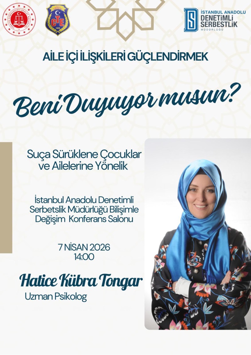 07.04.2026 Tarihinde Saat 14:00 da Müdürlüğümüz konferans Salonunda Uzman Psikolog Hatice Kübra Tongar İle Suça Sürüklenen Çocuklar ve Ailelerine Yönelik Aile İçi İlişkileri Güçlendirmek Semineri Yapılacaktır.